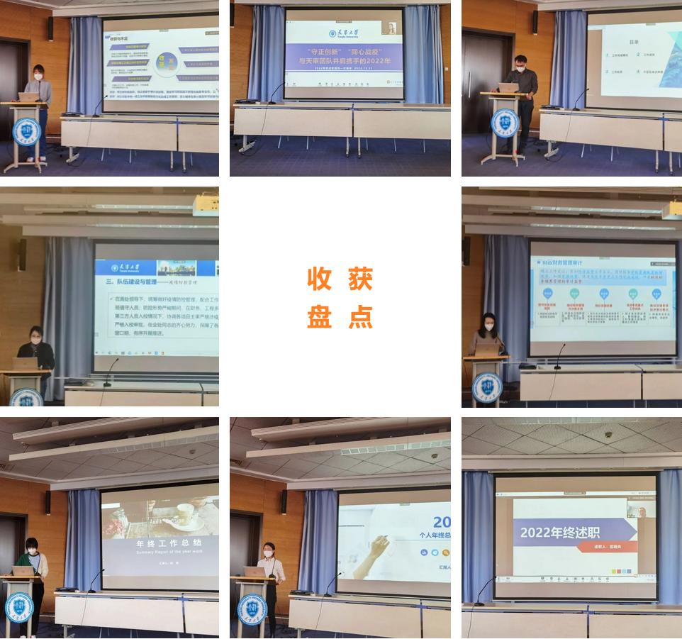 述职环节,各岗位人员对照 2022 年审计工作、年度计划,逐一汇报任务完成情况,对标《天津大学审计处业务考核量化评价细则》中22项考核指标,从个人达标情况和贡献价值具体谈收获进步、差距不足、改进思路和举措。
