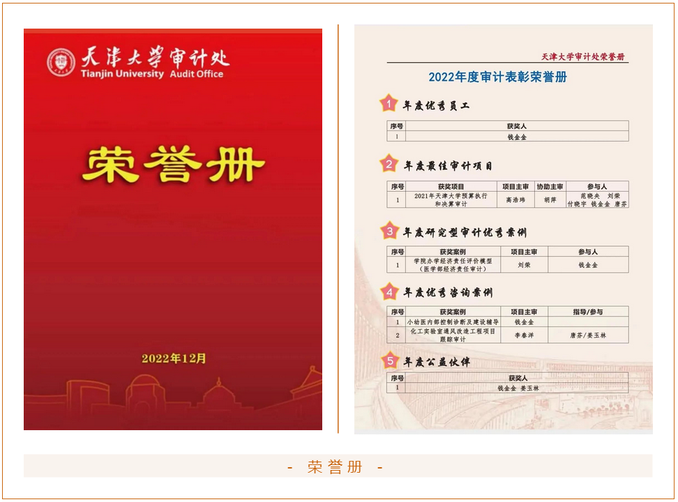 2022年审计工作计划提出“抓实工作研究、抓准工作方法、抓好荣誉激励”的专项工作并与支部党建工作同谋划、同部署,围绕2022年工作计划提出的“以研究型审计推动改革创新和高质量发展”的年度工作主题,经支委会讨论,设置“年度最佳审计项目”“年度研究型审计优秀案例”“年度优秀咨询案例”“年度公益伙伴”四个奖项,以表彰在年度内完成效果卓著的审计项目、契合学校改革在审计和评价方法的创新成果、履行内部审计咨询服务职能为学校和院级单位开展咨询工作成效显著的项目、积极参加学校疫情防控志愿工作以及团队协作表现突出的伙伴。