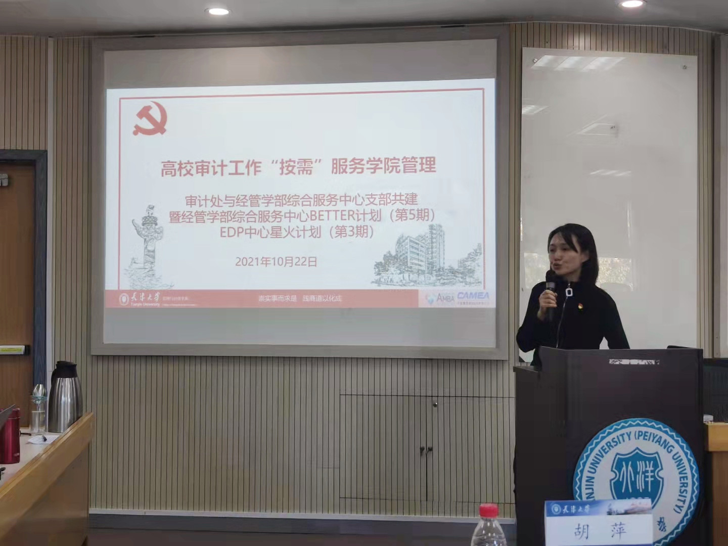 根据党史学习教育安排,践行“办实事”目标要求,审计处支部组织开展“服务院级单位管理提升系列行”活动。受经管学部邀请,10月22日,审计处支部业务骨干与经管学部EDP中心(高管培育发展中心)全体职工、综合服务中心党支部近五十人于卫津路校区25教学楼3A教室,开展专题支部共建活动。本次活动围绕经管学部“高端培训风险防范”“院级单位管理重点”等管理实践需求展开。